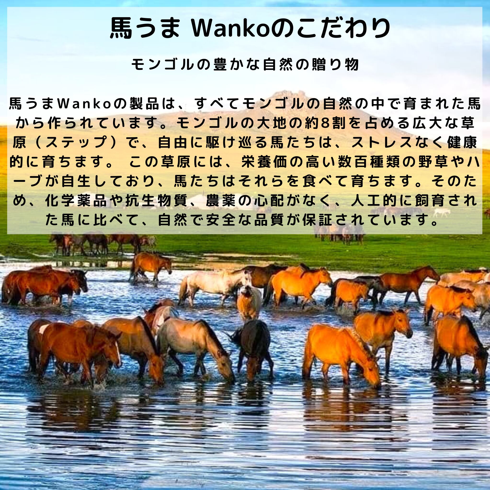 「馬うまwanko」は、愛犬の健康と幸福を追求し、モンゴルの大自然から贈られる最高品質の馬肉を使用したプレミアムおやつブランドです。